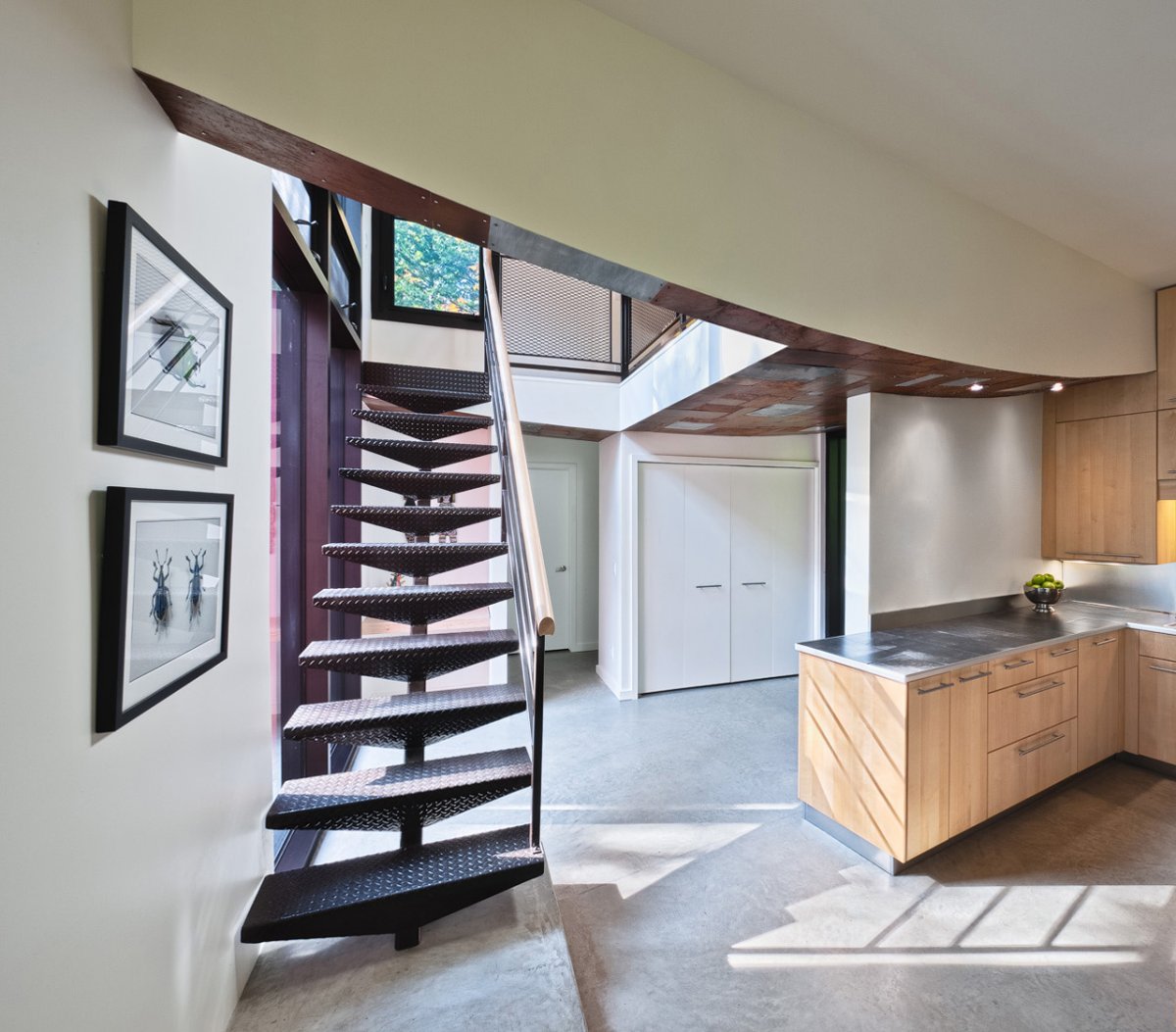 แทนที่จะ "walling-in" พื้นดินในระดับที่จะบรรลุความเป็นส่วนตัวของพวกเขา จะทำกับ expanses มากมายของเครื่องแก้ว และจะมีการจัดวางที่ขอบของสถานที่ สามารถมีต้นไม้หนาแน่นมากที่สุด ปริมาณ Loft และเซอร์ราวด์เตาผิงจะโผล่ขึ้นมาด้วย "ผ้านวม" ของแผ่นโลหะ ได้แก่ ทองแดงและแผ่นสังกะสี งานพิมพ์ที่ลูกค้าได้รับจากเพื่อน printmaker จำนวนมากเพลถูกแกะสลักที่มีภูมิทัศน์ได้จาก printmaker เดิม แต่ส่วนมากจะแกะสลักผลงานที่สร้างขึ้น โดยลูกสาวของพวกเขา แต่แผ่นยัง-unetched จำนวนมากที่สามารถเอาออกได้โดยลูกค้าและเพื่อนของพวกเขาไปที่กระท่อม และติดตั้งใหม่ด้วยวิธีนี้ที่บ้านเก็บเรื่องราวที่ผ่านมา